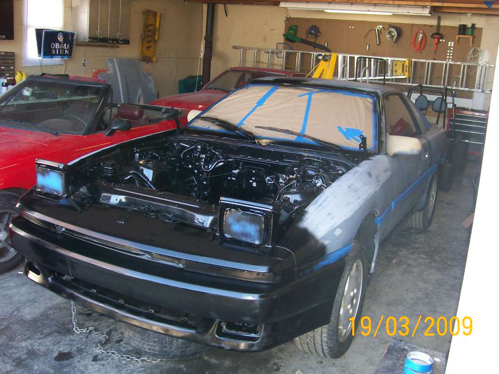 Almost finished masking the car off. Did a quick rattle can paint spray to the nose just to give me an idea what it'll look like once I'm finished. Need to mask off the back glass on both sides. Covers have been removed from the back hatch, it's getting painted too.