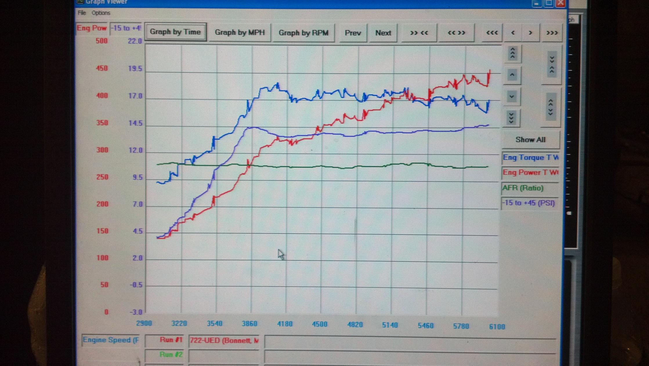 i mean, anyone can go grab a 383 and make 500+ with a shot of nos or a turbo/super. he loves tuning and loves these motors, so he rocked it. and i think he did a damn good job. he also has a black n/a build that we were going to dyno, but didnt have time. in all technicality, he could have swapped in a duramax or powerstroke, make WAY more power, and gotten 10 times the fuel efficiency out of it. would he have been happy with it? absolutely not. anyway, its pretty sexy, and i think hes makin some damn good power, and theres alot more left on tap. who can say they are tappin 450 plus on only 14 lbs of boost out of one of these motors? not many, in fact, not many motors period can accomplish that. i dont have the dyno sheet for it, but he was messing with the EBC on MSIII on day, and accidentally spiked to 28 psi. the reward, was staggering, he hit over 575 hp and 560 tq, at the wheels, in 92 degree heat. after WCF, he was over 600 by a long shot on both factors. all that through an auto tranny and a straight axle.