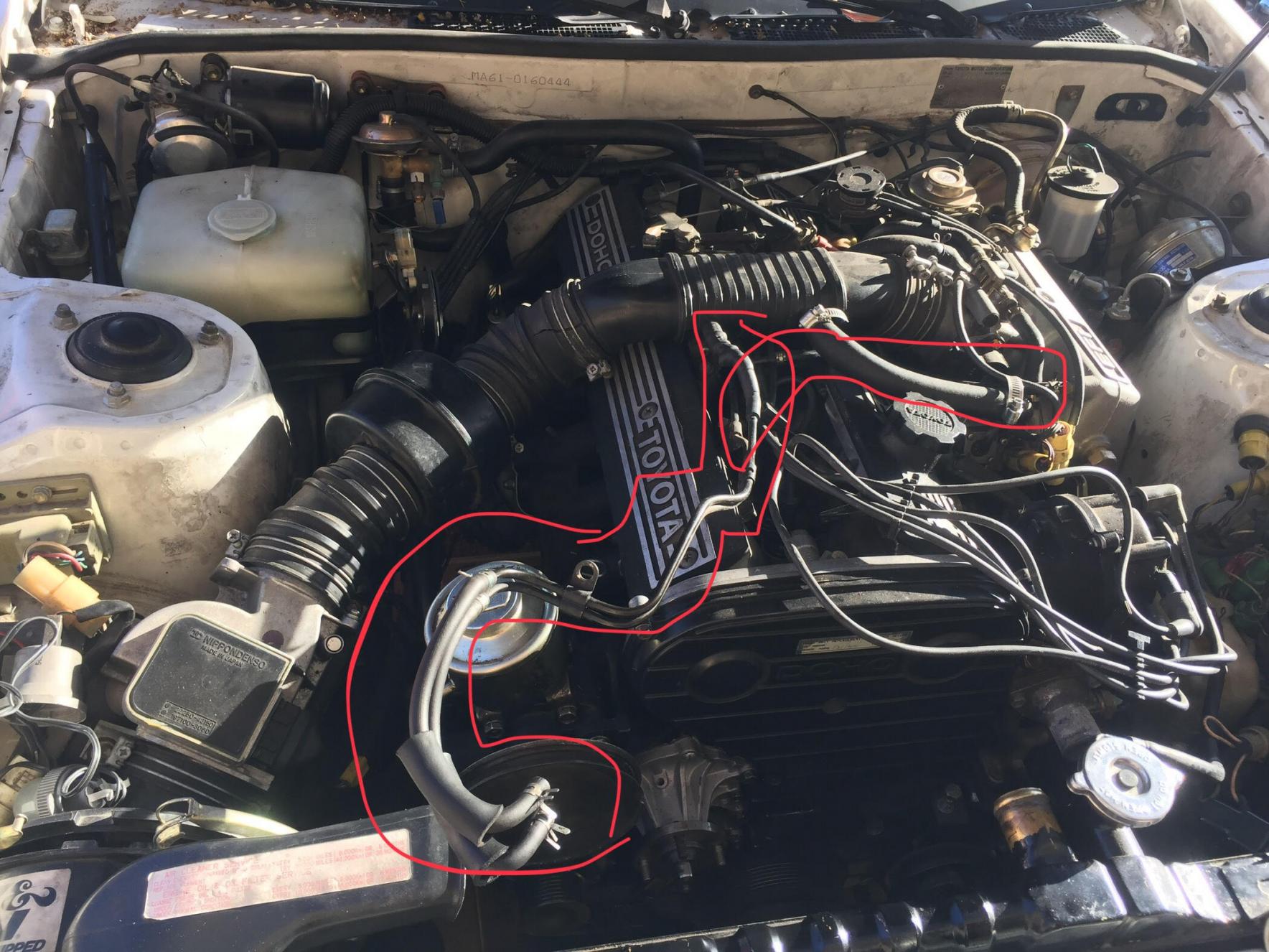 I wanna start of by apologizing for my lack of knowledge on cars. I'm 17 and this is my first car. I bought it from a kid who didn't know too much about cars himself. He had just gotten the water pump replaced and the people who did it for him didn't put the car back together. So know I've slowly been working on it but I can't seem to find where exactly these vacuum lines connect to. One comes directly out of the EFI case and the other comes out of the air intake pipe. You can check it out in this picture i marked up. If anyone could show me where they really go that would be awesome. Thanks.