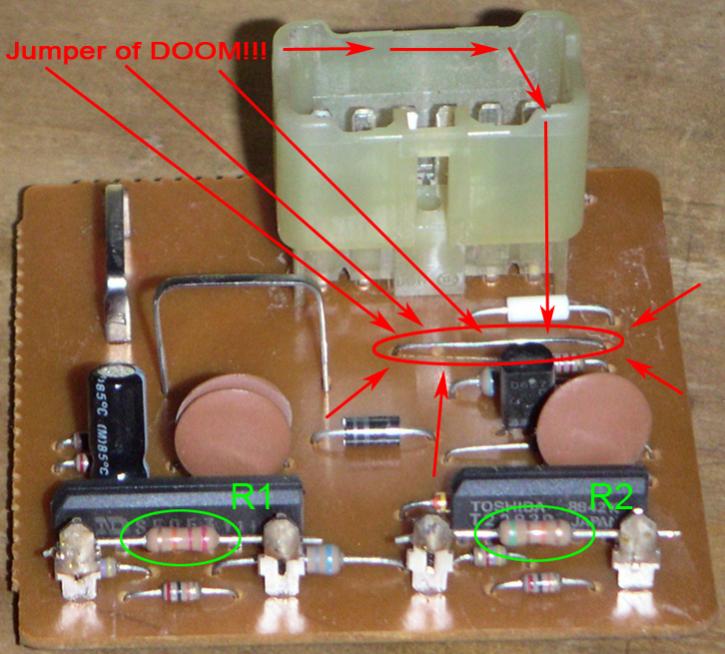 Attachment 4499 The "Jumper of DOOM" is the most common point of failure, then fractured solder unions for the harness socket, then oxidation of the harness connector and socket. Typically, I've found that a corroded harness and fractures in the solder only cause intermittent failures or lights that are just dim but with a persistent dash indicator. The jumper I've seen completely burn holes through the board and cause a complete lighting failure. "R1" and "R2" are used to calibrate the sensor for a certain load. If you convert to LED lighting you may be able to keep the failure sensor in place by swapping these out with a different resistor (use a potentiometer to find the value, test it with a meter when you find it and then swap in a resistor for that value). |