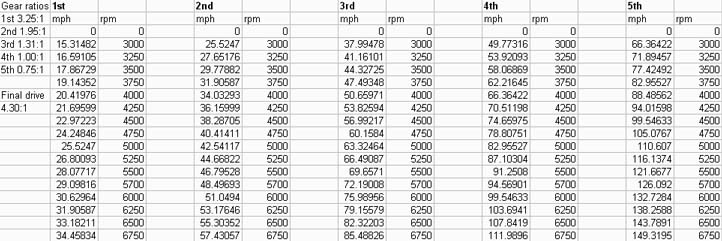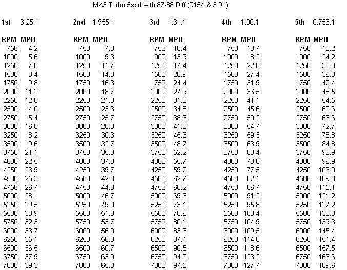 75's right for 5th gear in a N/A at about 3300RPM. W58: (that's the non-turbo transmission) Attachment 3095 R154's: Pre89 (3.91:1) Attachment 3096 89+ (3.73:1) Attachment 3097