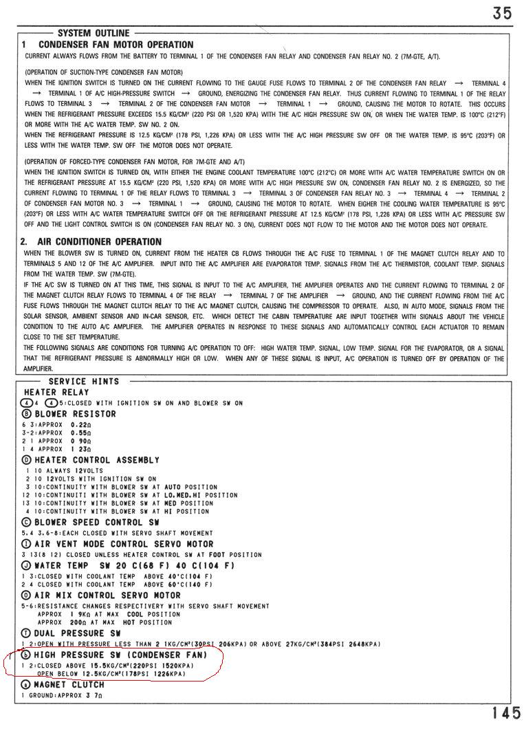 Thanks. I thought of that but unfortunately the switch that does not work is the high pressure switch not the dual pressure. The high pressure switch activates the condenser fans when the pressure goes above 220psi. The normal high range on the ac is about 213psi. Bottom line is that when I have my ac on and the car idles at a light the condenser fans do not turn on. Heat starts to build up on the condenser and the pressure starts to build up real high and the cooling inside the car starts to drop. I checked the condenser fan circuit and it does work. I can switch or ground the high pressure switch and fire up the fans. I can do the same with the high temp switch on the thermo housing. Personally I would just probably put in a switch and fire it up at idle like you suggested but my wife drives the car occasionally. I would hate to remove that switch with no schrader valve and lose all my expensive r12. See the photos.