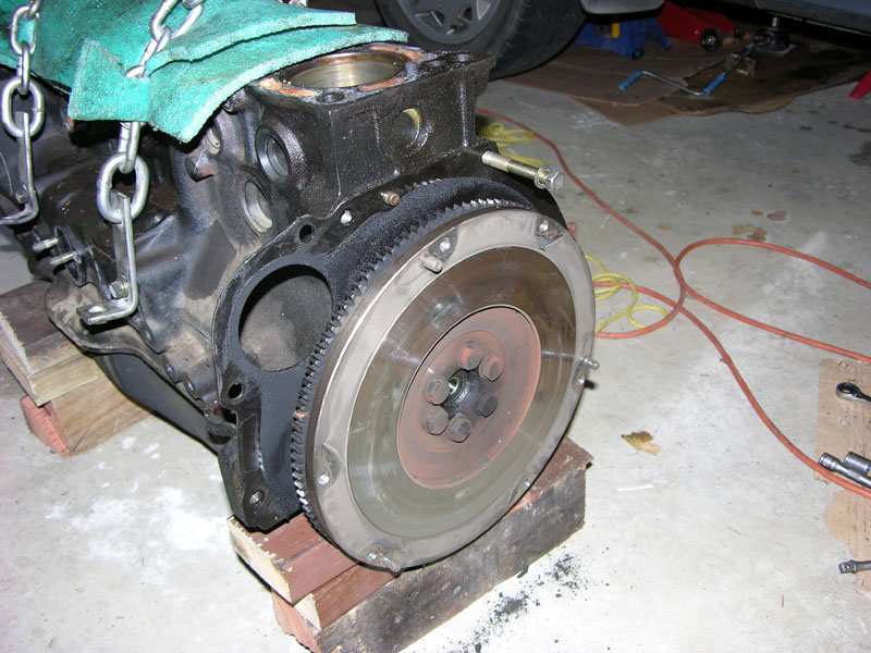 Attachment 2329 Forgot to pull out old pilot bearing on the crank before the shop work was done so I had to pull it myself but did not have a tool. Remembered an old technique for years past – packed the pilot hole with grease and used a 3/8” socket extension and hammered into hole. The hydraulic pressure of the grease from behind pushed out the bearing. Took 4 hits with grease repack but it came out pretty smooth. Put new bearing in with a ?” socket just tapping on the edge of the bearing. Attachment 2330 Mounted the new clutch and aligned the disk with the tool. The book says to torque the clutch pressure plate to 15 pounds but that seemed kind of low. I thread sealed the flywheel and clutch bolts anyway. Now it was time to chain up the block and lift it back into the car. I am dong the block with out the head because it’s easier to move around and get in a do the bell housing bolts without the head on. I was concerned about alignment with the transmission shaft as it seemed real easy to snap it off if things were not aligned right when lifting the block back in. Attachment 2331 Now – a few things I learned. First, put the two top bell housing bolts in before doing anything. I found it impossible to get them in after the transmission was jacked up to the firewall which you need to do to get the right angle to join with the block. Second, jack up the transmission all the way to the firewall to get a better angle. When you lift the block in, the front of the engine is about 30 degrees up from the rear so the oil pan can clear the lower support beams. Here is the important part – unbolt the clutch slave cylinder from the bell housing so the clutch fork is able to completely retract. It took me almost 2 hours in trying to match the block and transmission and not getting them together until I realized the clutch fork/throwout bearing was trying to engage the pressure plate that no mere human can push against. Disconnecting the slave cylinder allowed the clutch to slide in over the shaft with no pressure – SIMPLE. Attachment 2332 When I removed the engine, I unbolted the two support mounts from the block and not the frame – it was just easier due the angle of the frame bolts. On reassembly I bolted the transmission on before attaching the engine mounts – bad idea. It is impossible to put the mounts back on after the engine is set in unless you undo the frame bolts from below which I was trying to avoid in order to not mess with the alignment. In hind sight I should have placed the engine mounts on the frame before lifting in the engine. Oh well – it only took another half hour under the vehicle to fix this. Attachment 2333 A side note – After the block was in and the engine mounts tightened (total of 4 hours) I put a socket on the crank shaft and turned the engine to see if there was no binding and that the transmission and clutch were all still working After a few cranks I heard a loud POP! OH NO! sounded like I had just snapped something off. Im thinking something in the transmission?, Crank?, Piston? Anyway, just like anyone else, since I can’t figure out what it was – I just do it again! A few more cranks and again the loud POP. This time I notice the protective covering I had on the block deck to keep it clean was pushing out like a big balloon. Seems I had it strapped in tight enough that it created a seal so when the piston pushed up – it blew it out with a nice pop. Good news is that the engine works! Now I get to go under and finish bolting in the bell housing and stiffeners |