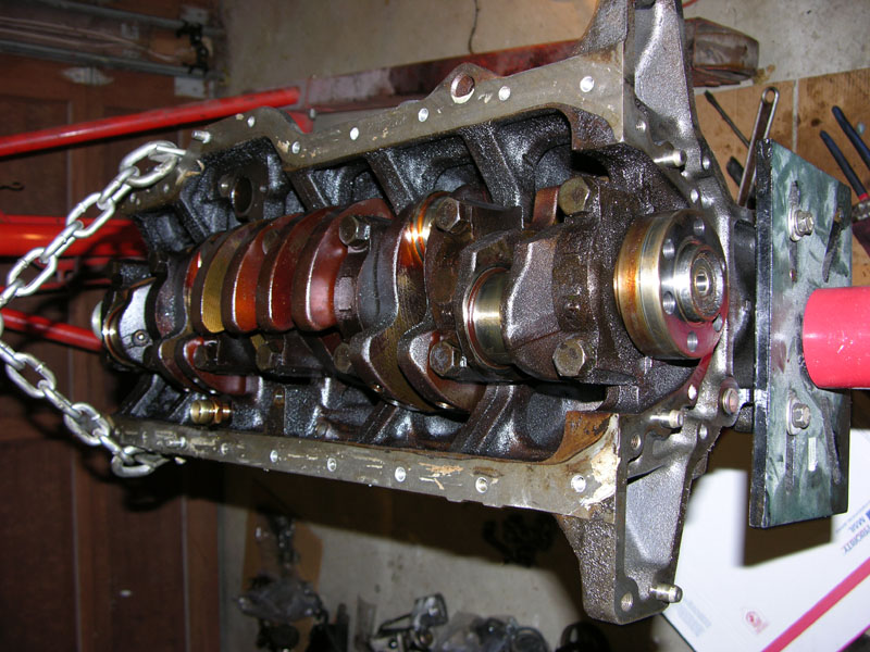 Well, since the block has to come out – in comes the hoist. I put a jack under the oil pan and transmission and unbolted the bell housing and engine mounts. I bolted the chains to the engine mount holes since I did not want to use the head bolt holes if one of them was already cracked. Balanced just fine and lifted right out by my self. This engine lift is a rally great tool you only get to use a few time in your life but it really works.