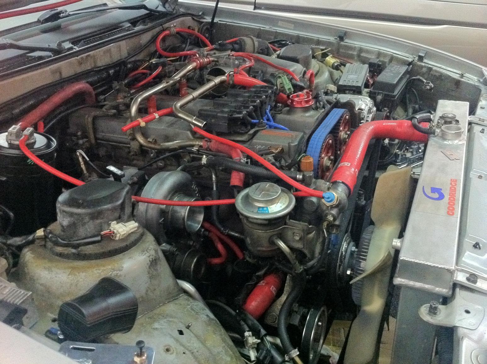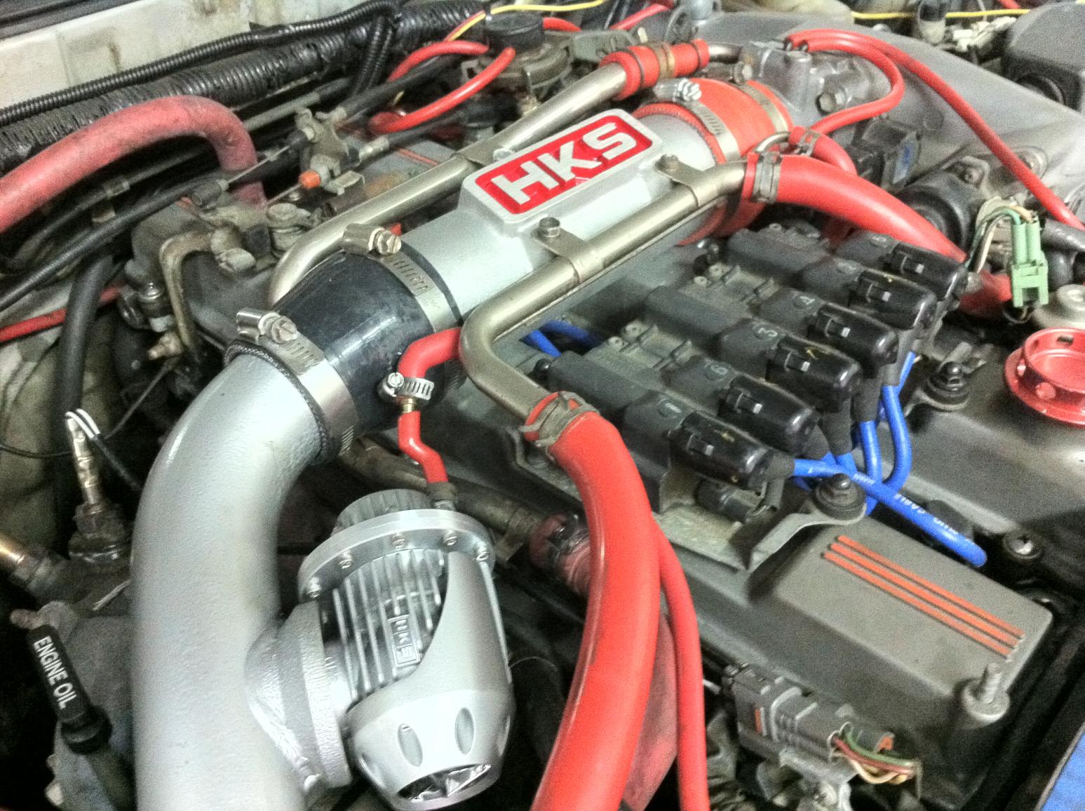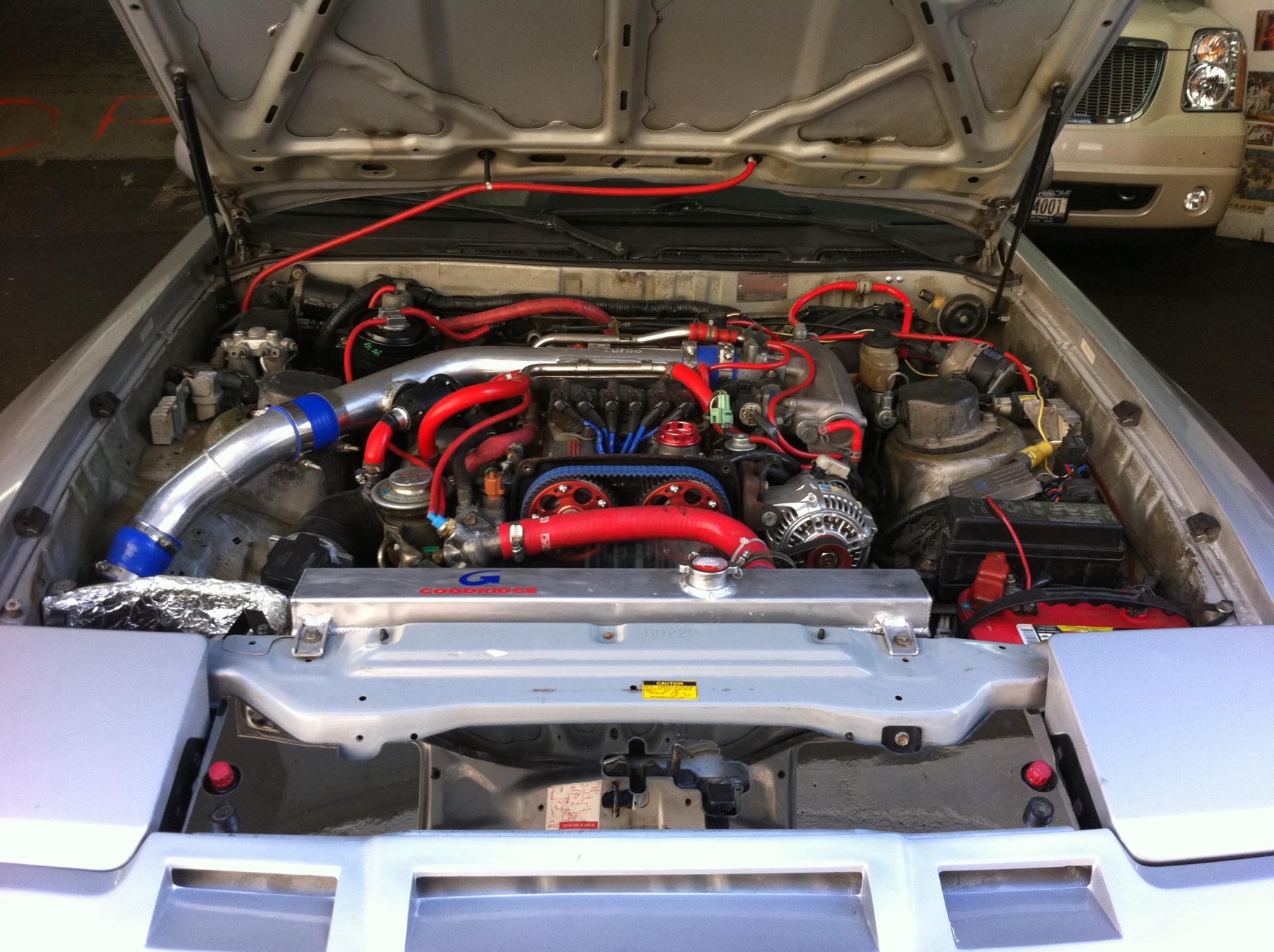 i decided to change my old intercooler configuration to a more efficient system. my old setup made the hood bay look tacky and not professional looking. it was 2.5in all around(minus the 2.25in pipe located near the passenger fender) with a big ol intercooler that weigh 30lbs! it measured 24in in length, 11in H, and 3.5in W. i did my homework and found out that bigger is isnt always better when talking about intercoolers. so i opted for one that weighs 11lbs and measures 28in X 7in X 2.5in. i also changed the pipes in my hood bay to all hks pipes, the bbv is a ssqv 3. i also added an oil cooler that is 19rows measuring at 11in X 6in X 1.5in with a 5.5in spal fan. the block off plate was purchased as well to have a direct air flow and i went from electric fans back to clutch fan. i must say that the clutch is much better. let me know what you guys think ![]() (my old setup) |
