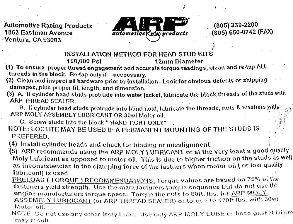 80ft lbs with moly, 120ft lbs with regular 30wt oil. Here's a scan: I'll look to see if I have one for bolts lying around when I have the time and think on it. Now if you're saying 115ft lbs when using oil you need to specify; ARP bolts come with much better lube and as such if someone doesn't understand and torques to that level they will destroy the fasteners and risk damaging the head.