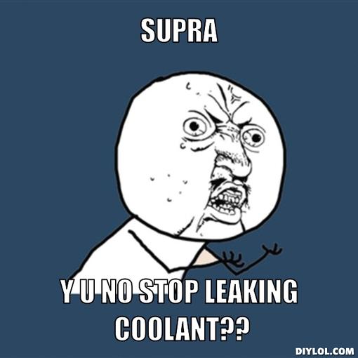 For the benefit of any readers who may stumble upon your unfortunate situation, would you mind posting what it was exactly that eventually got the car to start? I sure would like to know. Take a little vacation from the car and go back when you're fresh to deal with the coolant issue. Old cars (mk3 supras!) can be frustrating. My supra has taken a healthy chunk of both my patience and money but I love having a car that people will look at for a couple minutes and still ask me "what kind of car is that?". Unfortunately it is usually followed by "you're leaking coolant". |