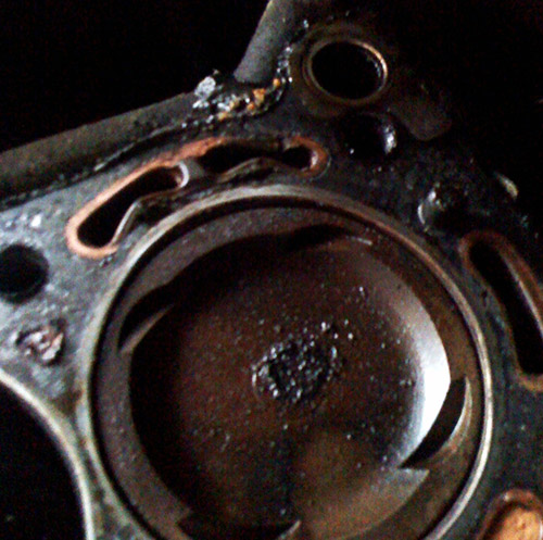 Got the head off today, #10 and #14 head bolt stripped out and took forever to loosen, hex head bolts...never again...They were pretty seized up so I wasn't surprised they stripped, actually so f'in seized up had this happened: Attachment 4577 Guy at Sears: "I've never seen a hex bit break clean in half like that" Me: "You're welcome..." Anyways here's the problem cylinder: Attachment 4578 #6 on exhaust side and #5 was swollen but didn't blow. Ideas about why it happened? Running really rich? That black in the center is the only buildup on that cylinder, otherwise the rest is spotless. #1 is black as night which I'm assuming is "normal" buildup and brought me to the conclusion that #6 was running really rich. |