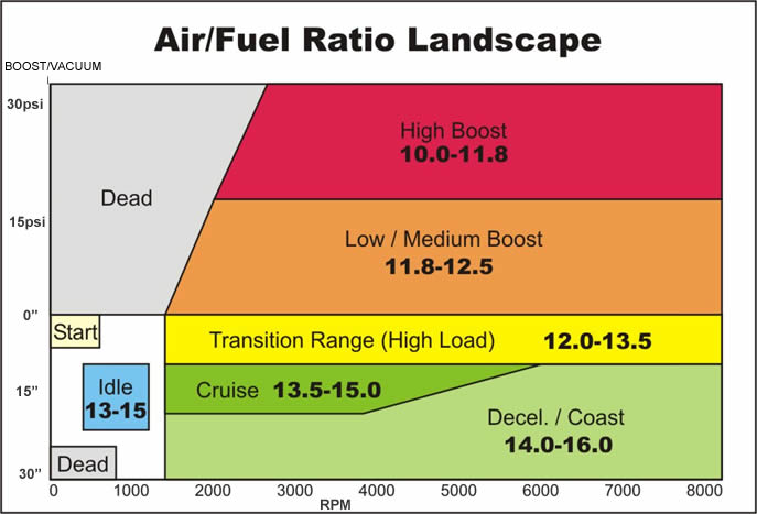 Mixture under boost is about 12.5:1, known by a reworked thermal conductivity A/F ratio sensing cell following a coil of 1/4" cooling tubing run from the Lipp to the front. A small 12V solenoid (stainless) valve blocks it in to retain the last reading, which gas velocity effects through the cell require. Early-on I bought a Dawes 4 LED device which reads the last couple of millivolts at the rich end of the stock A/D ratio sensor. Its got a precision voltage reference and a couple of National voltage to LED drive chips inside. It has matched the thermal conductivity cell exactly. The thermal conductivity cell is not really visible unless the roving (NJ) emission police look under the horizontal sheet which is integrated with the hood latch. The LED readout and small meter for the TC cell are in the ash tray. Speaking of the police, the Raptor BOV is inside the right fender, and is recirculated to the bottom of the accordion hose. Thanks for the assistance. I'll be happy to send a tip for any further information. Berniek |