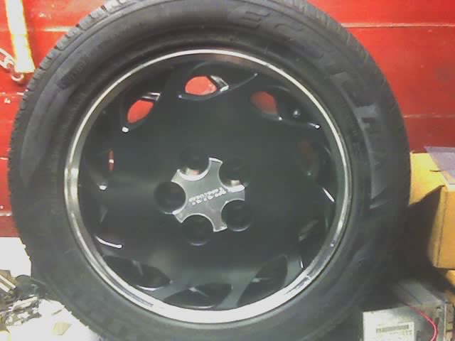 niiice!! i like now.. you need pics with it on a car, and.. u should take a pic with the center cap on if its dry maybe paint where it says toyota on the center cap, black? might be hard tho. good job also.. i take it the black paint isnt that even around the edges? because you had to tape it? wonder if there would be any way to avoid that.. hmm