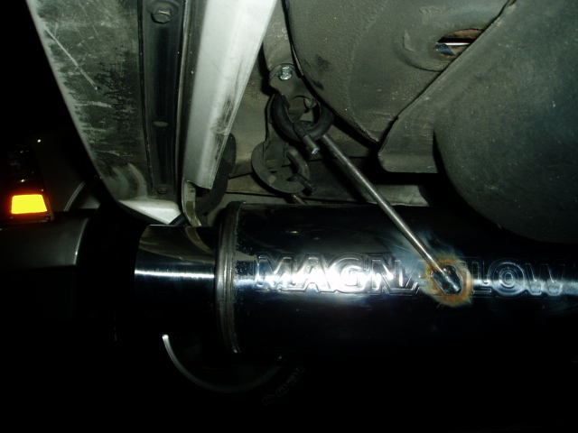 I just got a brand new custom exhaust put on my car. It consists of a Magnaflow racing muffler with custon 2.5" exhaust. And for those of you that are thinking of cutting off thier exhausts, DO NOT DO IT. I probably gained 20 hp just from putting this on. And everything runs alot smoother. And the turbo spools around 50% faster! Yay power! The note is good, not too loud, but a good agressive tone. I can't wait to get my new BOV, should sound sweet.